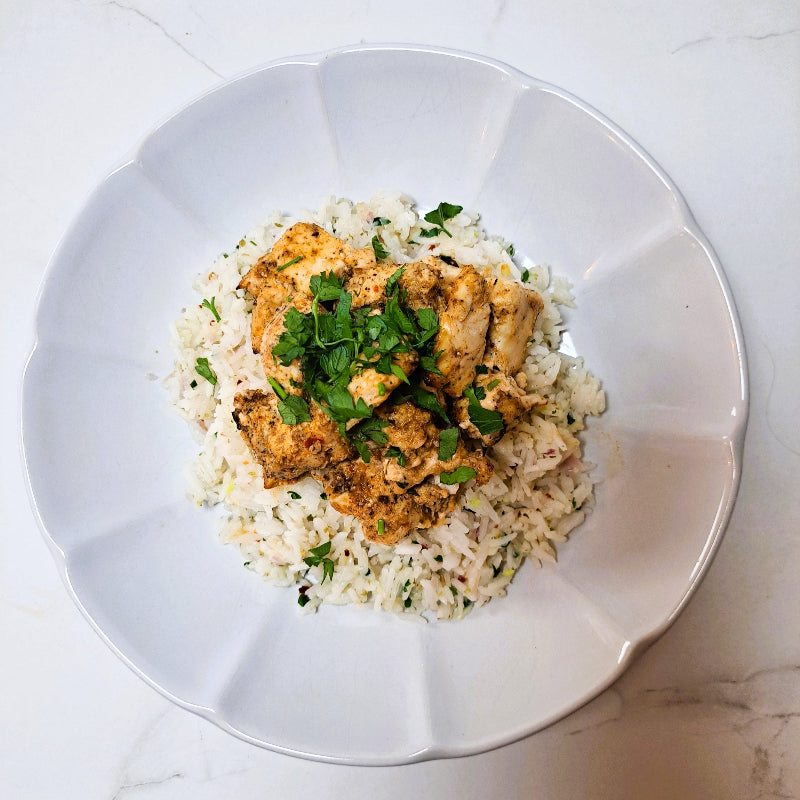 Chicken or halloumi tossed in a creamy, mildly spicy Bang Bang sauce, served over fluffy lemon garlic herb rice and paired with zesty, spicy pickled cucumbers for a refreshing crunch. It’s a bold, balanced dish that hits all the right notes—sweet, spicy, and satisfying.