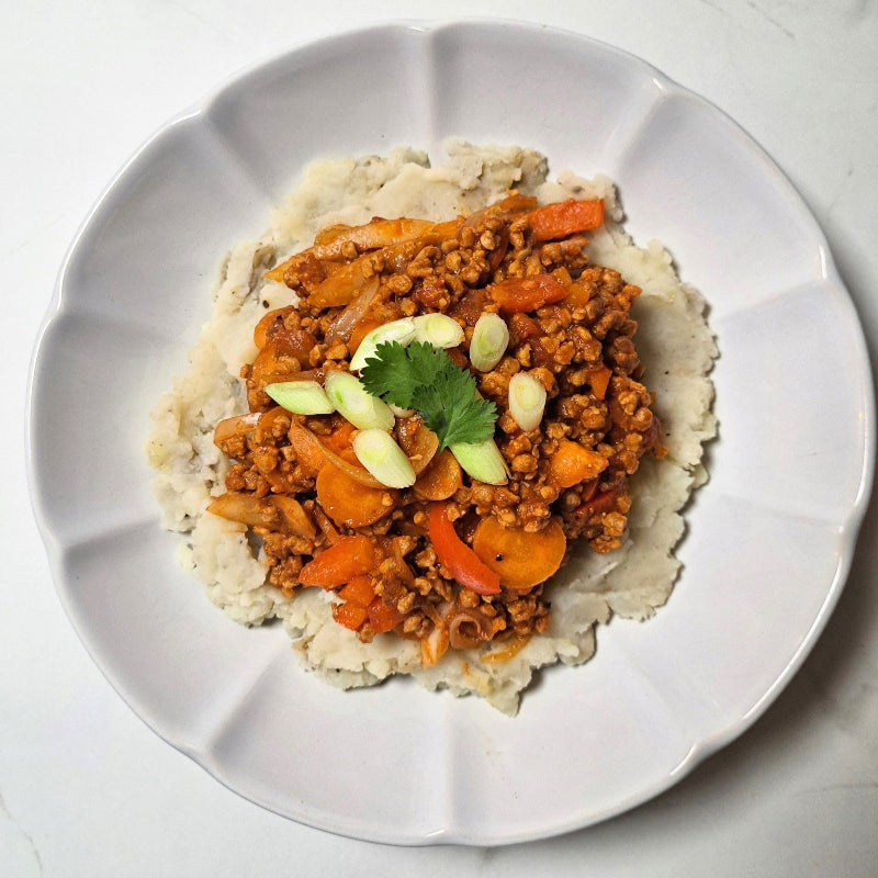 Beef/Vegan Mince infused with smoky chipotle spices, layered over creamy mashed potatoes and tossed with sweet red peppers, carrots, and caramelized onions. This bold, protein-packed dish balances heat and comfort in every bite, perfect for fueling your day the right way.