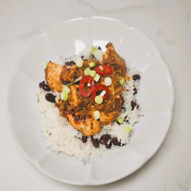 Jerk Chicken or Vegan Protein with Rice & Peas