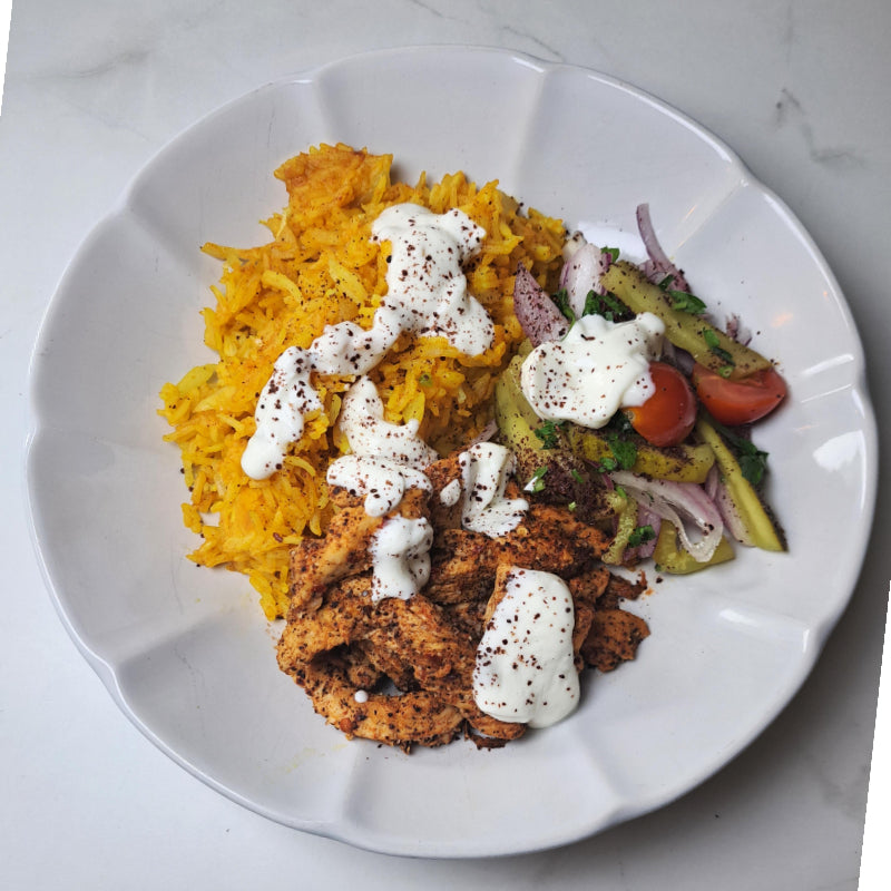 Fragrant golden-yellow rice meets tender shawarma seasoned protein, finished with a cooling garlic yogurt, crisp slaw, sweet tomatoes, gherkins, and a dusting of sumac. A vibrant, satisfying meal that blends Middle Eastern flair with macro-balanced precision.
